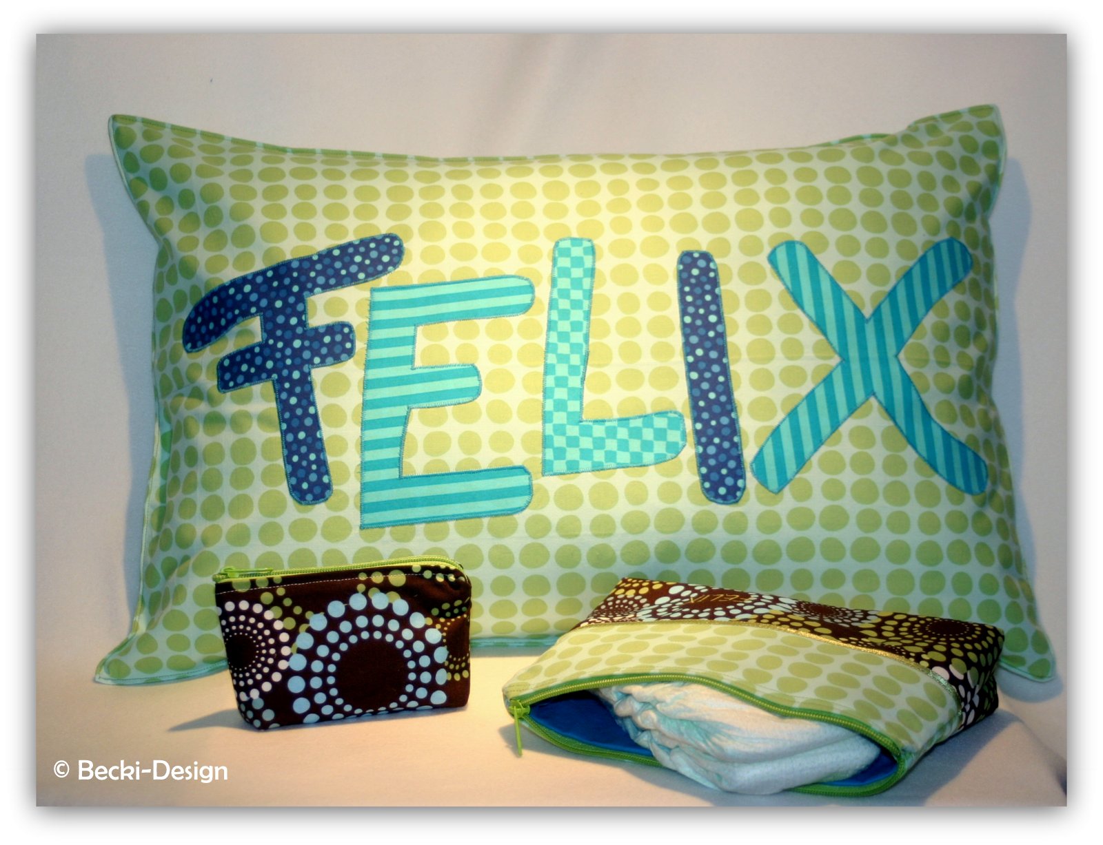 Hier kommt nun die Fortsetzung von meinem gestrigen Blog. Zu den Täschchen gehört auch noch dieses schöne große kuschelige Kissen, dass dem jetzt noch kleinen Felix sicher auch noch gefällt, wenn er schon älter ist. Ich freue mich schon die netten Sachen an die Mama von Felix zu übergeben.