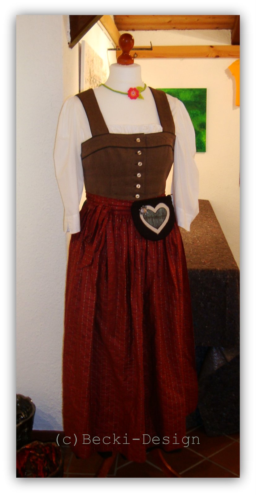 Das wichtigste ist an diesem Objekt natürlich das Dirndltäschchen. Das fertige ich auf Grund einer Beschreibung oder eines Fotos der Kundin an. Die Tasche bereichert das Dirndl um einen echten Hingucker. Mir ist schon mehrfach bestätigt worden, dass es einen super Dienst geleistet hat. Nur die wichtigsten Dinge haben darin Platz und sind sicher verwahrt.
