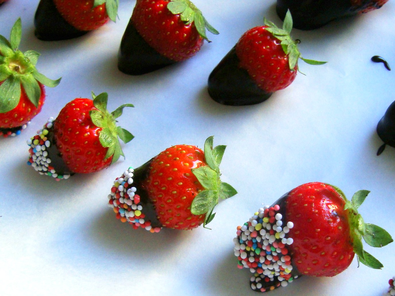 Den Tipp, die schokoladigen Erdbeeren dann auch noch in ein buntes Streuselbad zu tunken habe ich in irgendeiner Zeitschrift beim Durchblättern entdeckt. Zum Glück ist es mir auch wieder rechtzeitig eingefallen. Was soll ich sagen – das Obst war schneller verputzt, als die auch sehr leckeren Cup-Cakes.