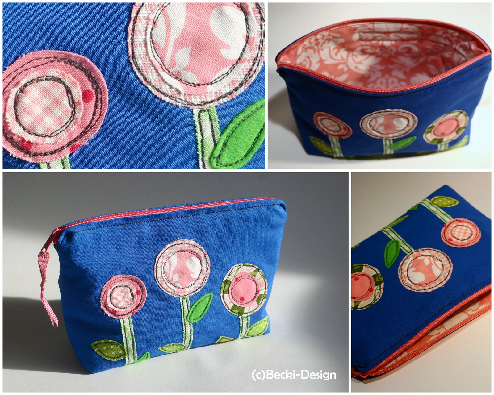 Das war wieder mal schön – ich konnte einfach machen… und die Ansage war: eine Schminktasche mit mittelblauem Stoff und mit rosa Blümchen – darf ruhig etwas verspielt sein.