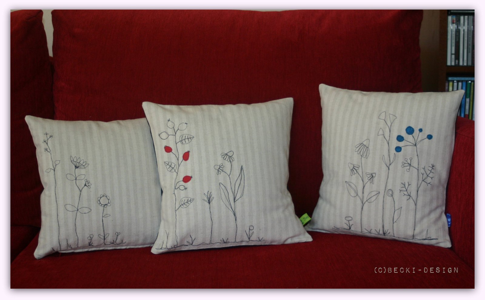 endlich habe ich es geschafft wieder mal eine Idee, die schon lange in meinem Kopf rumschwirrt umzusetzten. Jetzt, wo die Blümelein verwelken und mit letzter Kraft Samen produzieren, musste ich immerwährende Blüten auf’s Kissen bannen.