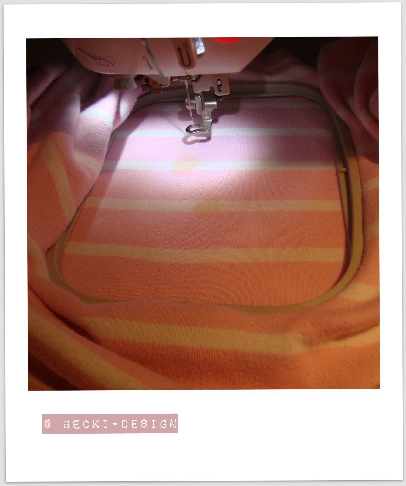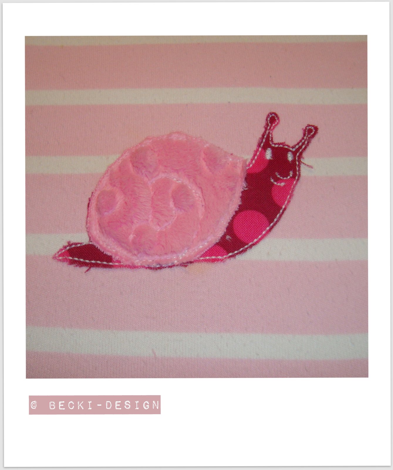 Vor Weihnachten habe ich ein paar ganz süße Tierchen erstanden bei Anja Rieger. Vor Weihnachten habe ich dann gar nicht mehr ausgiebig geschafft sie auszuprobieren – nun schon! Also: T-Shirt eingespannt, nach kurzer Rücksprache mit der Knirpsin Tierchen ausgesucht und: ” Mama, Du sollst den Kuschelstoff nehmen!” Stoffwahl, konnte ich dann das Schneckchen über dem Fleck platzieren.