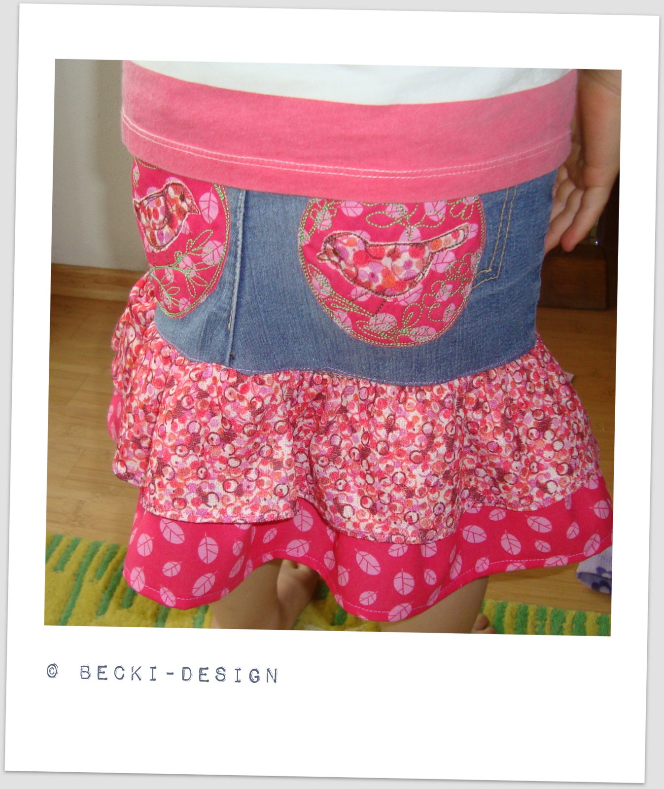 bei Julia habe ich letztens ein super tolles Tutorial gefunden. Und gerade jetzt kam das genau zum richtigen Zeitpunkt. Die Hose war schon von der großen Schwester ziemlich liebgewonnen und oft getragen und sah wirklich nicht mehr so dolle aus. Und jetzt? Na, schaut selber! Weil auch der Popo etwas sehr gelitten hatte, habe ich diese wunderschönen Sommervögel von Anja Rieger bemüht. Ich habe sie erst in den letzten Tagen gekauft und bin davon wirklich hin und weg. Ich finde alle Stickdateien, die ich bis jetzt von Anja gekauft habe wirklich qualitativ sehr sehr gut. Am allerbesten finde ich, dass sie wirklich sehr schnell gestickt sind und gleich ordentlich was her machen.