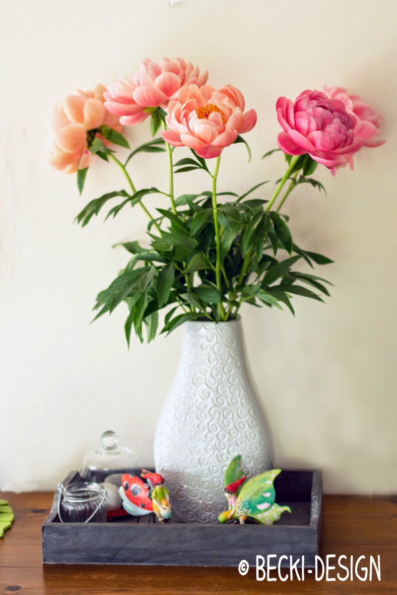 Heute zeige ich Blumen in meiner noch immer etwas neuen Vase, die ich mir habe machen lassen. Oh, mir gefällt sie soooo gut. Und ganz unspektakulär haben dort Pfingstrosen ihren Platz gefunden. Sie sind insofern beeindruckend, weil sie von Tag zu Tag die Farbe ändern. Während sie am ersten Tag noch pink daherkommen, sind sie nach einer Woche recht verblichen und haben dann nur doch die Farbei der Wand. Nach einer Woche haben sie es auch hinter sich und die Blätter fallen ziemlich zeitgleich ab…. Letztes Jahr um die Zeit hatten wir unseren Kommunionschmuck mit Pfingstrosen.