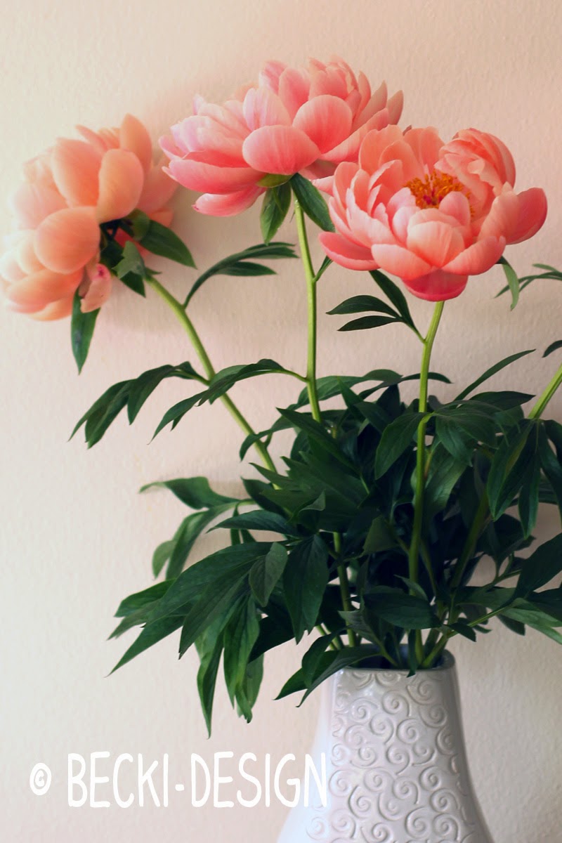 Heute zeige ich Blumen in meiner noch immer etwas neuen Vase, die ich mir habe machen lassen. Oh, mir gefällt sie soooo gut. Und ganz unspektakulär haben dort Pfingstrosen ihren Platz gefunden. Sie sind insofern beeindruckend, weil sie von Tag zu Tag die Farbe ändern. Während sie am ersten Tag noch pink daherkommen, sind sie nach einer Woche recht verblichen und haben dann nur doch die Farbei der Wand. Nach einer Woche haben sie es auch hinter sich und die Blätter fallen ziemlich zeitgleich ab….  Letztes Jahr um die Zeit hatten wir unseren Kommunionschmuck mit Pfingstrosen.