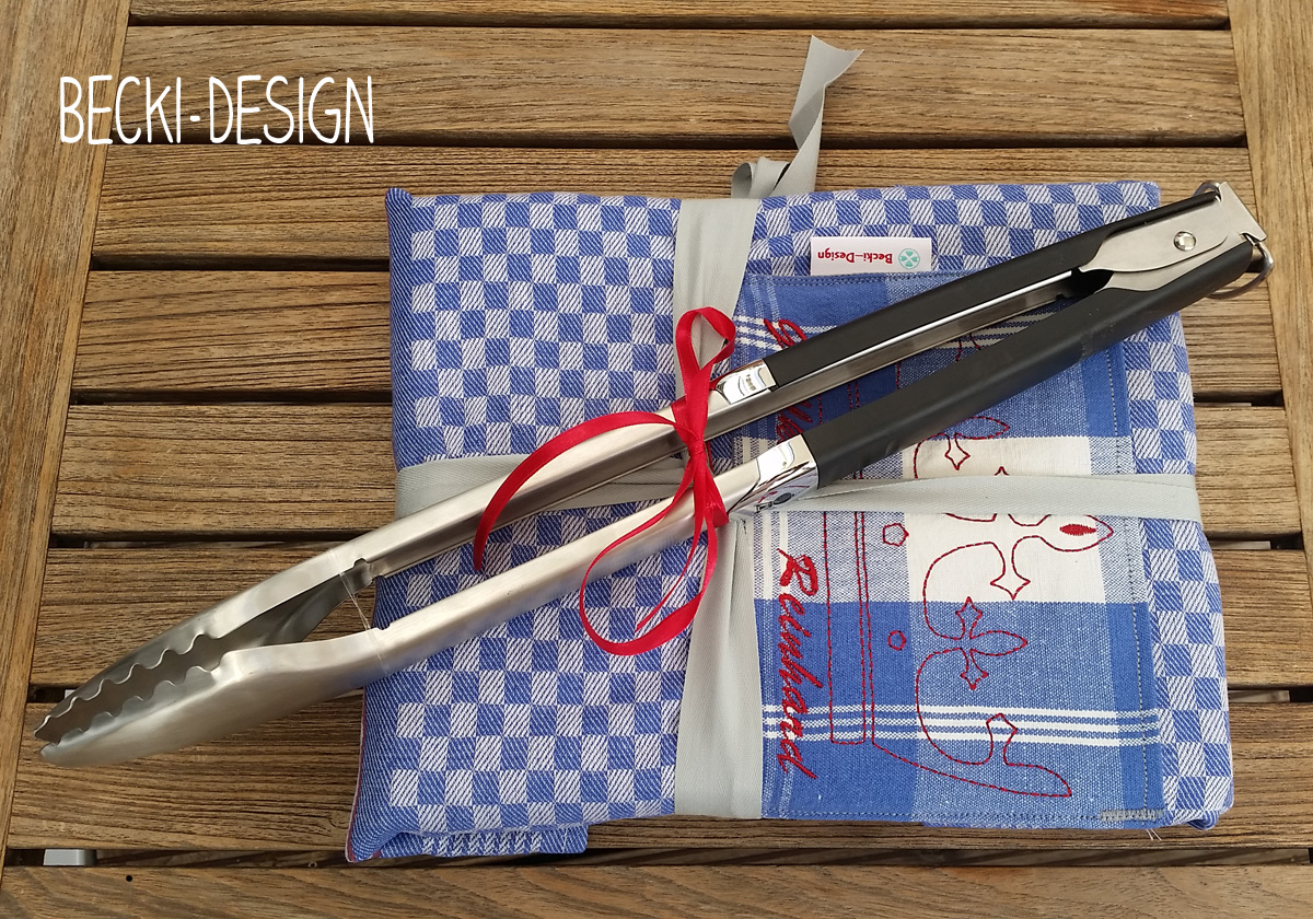 einen kleinen Nachschlag habe ich noch zu dem Post hier. Da hatte ich erklärt, wie ich aus einem Handtuch eine Schürze genäht habe. Hier zeige ich, wie ich mit der Schürze das zum Thema Grillen passende Kochbuch in die Schürze verpackt und mit der Grillzange dekoriert habe.