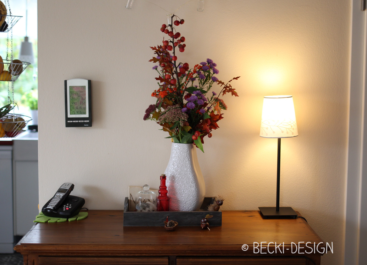 Und so sieht das Arrangement im Ganzen aus. Es steht wieder auf der Kommode am zentralen Platz unseres Wohnbereiches und ich erfreue mich bei jedem Vorbeigehen an den warmen Tönen. Dekoriert haben wir heute mit kleinen Kastanienbasteleien der Kinder