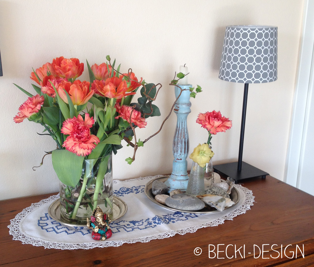 Da habe ich mich voll von anderen Blumenliebhabern bei Helga anstecken lassen. Warum nicht mal Nelken? Da habe ich ja ziemliche Vorurteile – ist das nicht die Blume der 50er Jahre? Aber damals waren sie rot oder weiß. Wer sich die heutige Auswahl anschaut, die der Markt so bietet, wird eines besseren belehrt. Sind das coole Farben, die es gibt. Ich machte mich entsprechend auf die Suche und fand diese hier. Ist die Farbverteilung nicht irre. Und dann habe ich ähnlich farbige Tulpen dazu gefunden. Perfekt! So habe ich ein knalliges Arrangement, das mich hoch erfreut.