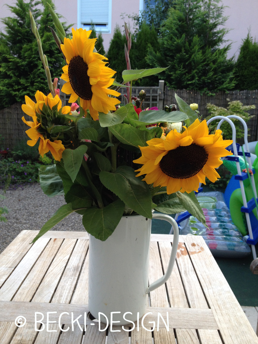 Sonnenblume! Jey, die Zeit der Sonnenblumen hat angefangen. Und außerdem habe ich die Saison der draußen-Blumen eingeläutet. Bei so großen Blumen mag ich die alten Kannen aus Emaille! Sie sind schwer mit Wasser gefüllt und fallen nicht um. Das ist gut, wenn es mal einen Windstoß gibt.