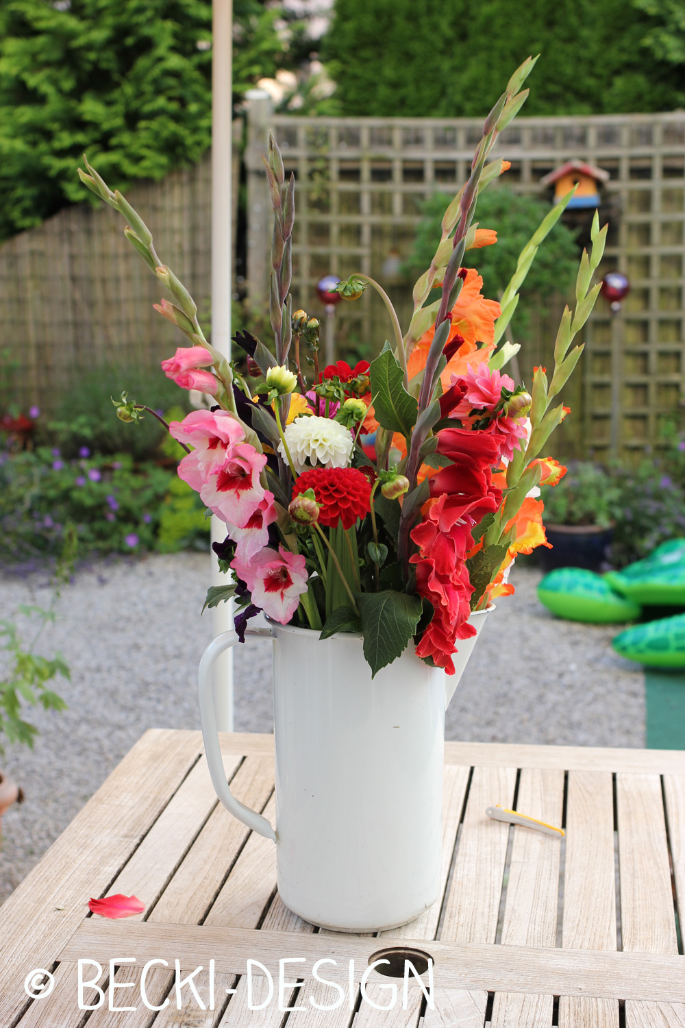 So haben also die Mädels Blumen geschnitten. Und ich sagte noch: “Bitte keine Gladiolen, die mag ich nicht!”. Was soll ich sagen, sie kamen wieder und hatten diese riesige Auswahl an Gladiolen geschnitten… “Ach das sind Gladiolen, Mama?!”