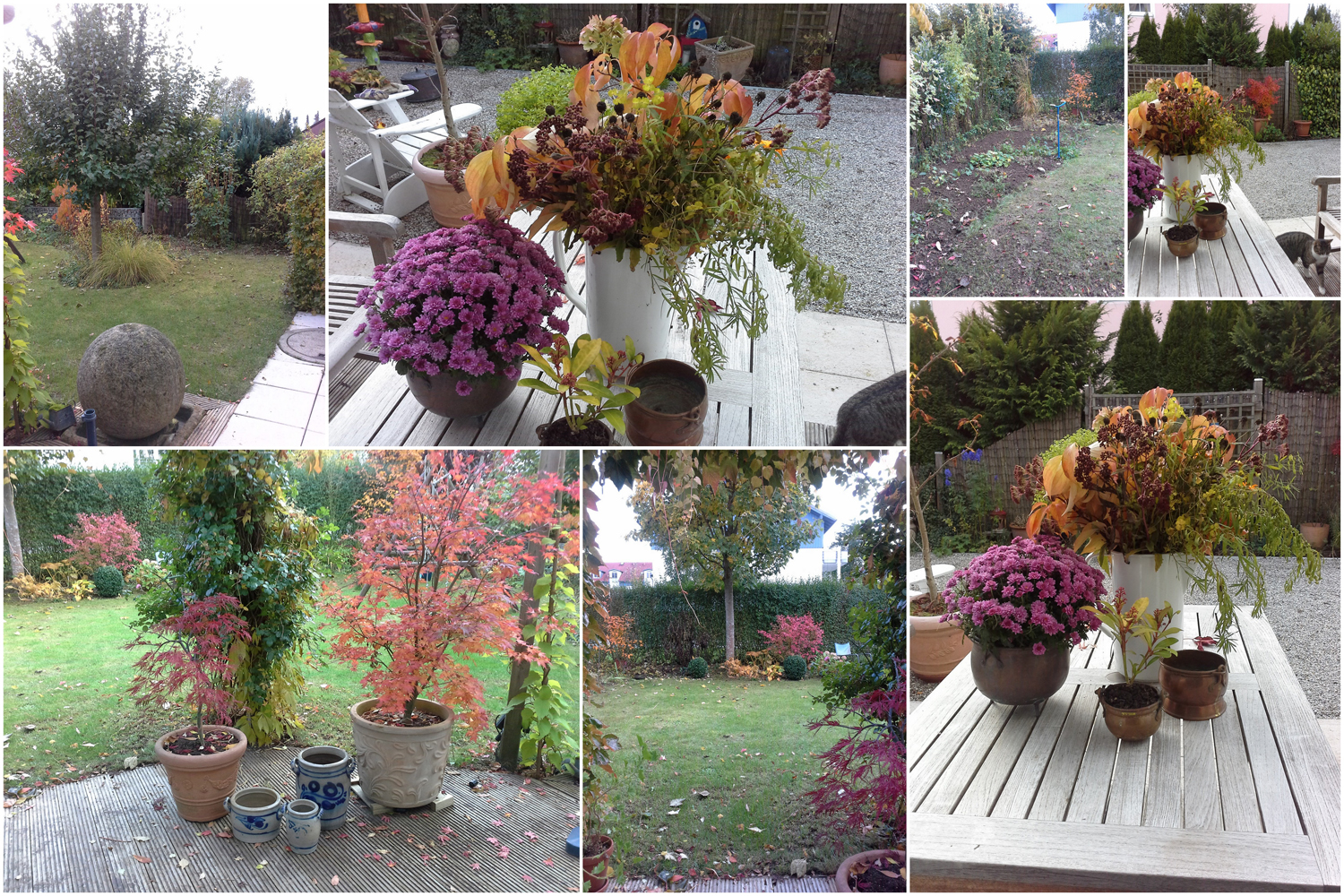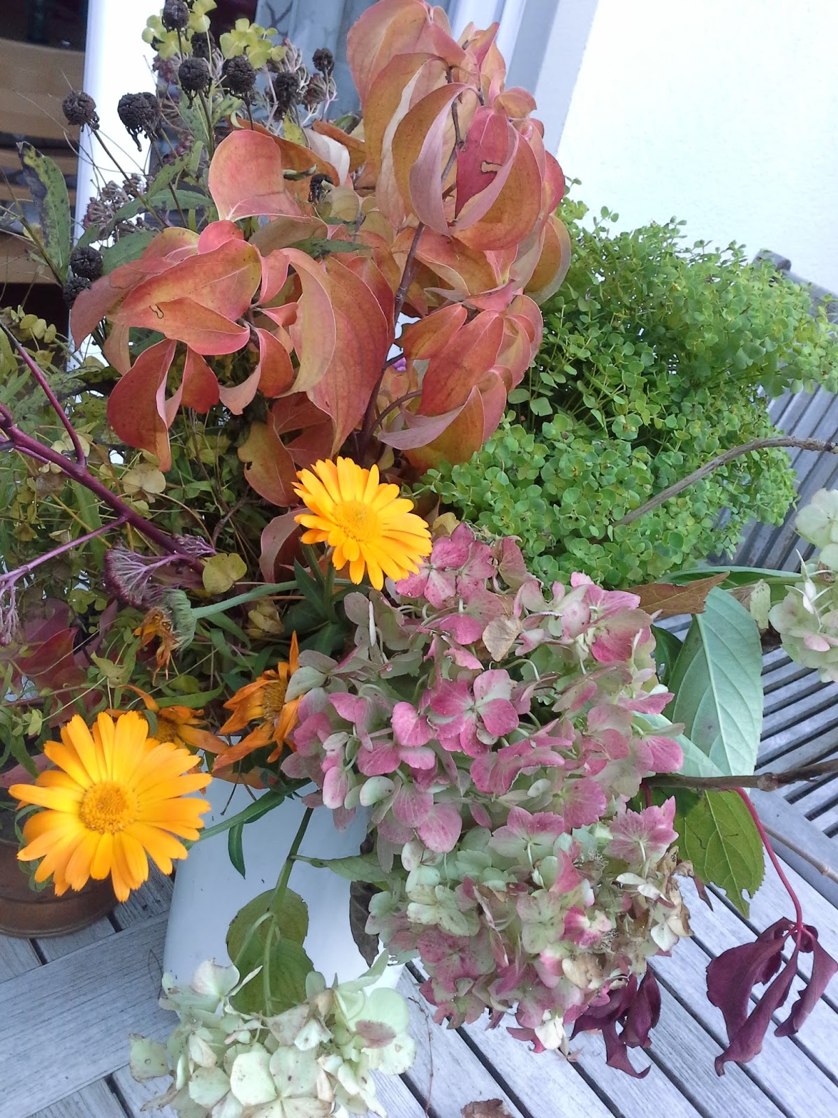 Die letzten beiden Wochenenden waren wir wirklich sehr fleißig und haben im Garten Licht geschaffen. Der Mann hat dann auch noch den Schnitt gleich mal zum Wertstoffhof gebracht. Einzig ein paar schöne Staudenreste und Gehölzschnitt habe ich gesammelt in einem Emaille Krug. Und dieser Schnitt erfreut mich nun seit Wochen als Blumenarrangement. Ich liebe diese Herbstfarben. Das Blumenarrangement steht vor der Terrassentür, so dass ich es immer sehe.